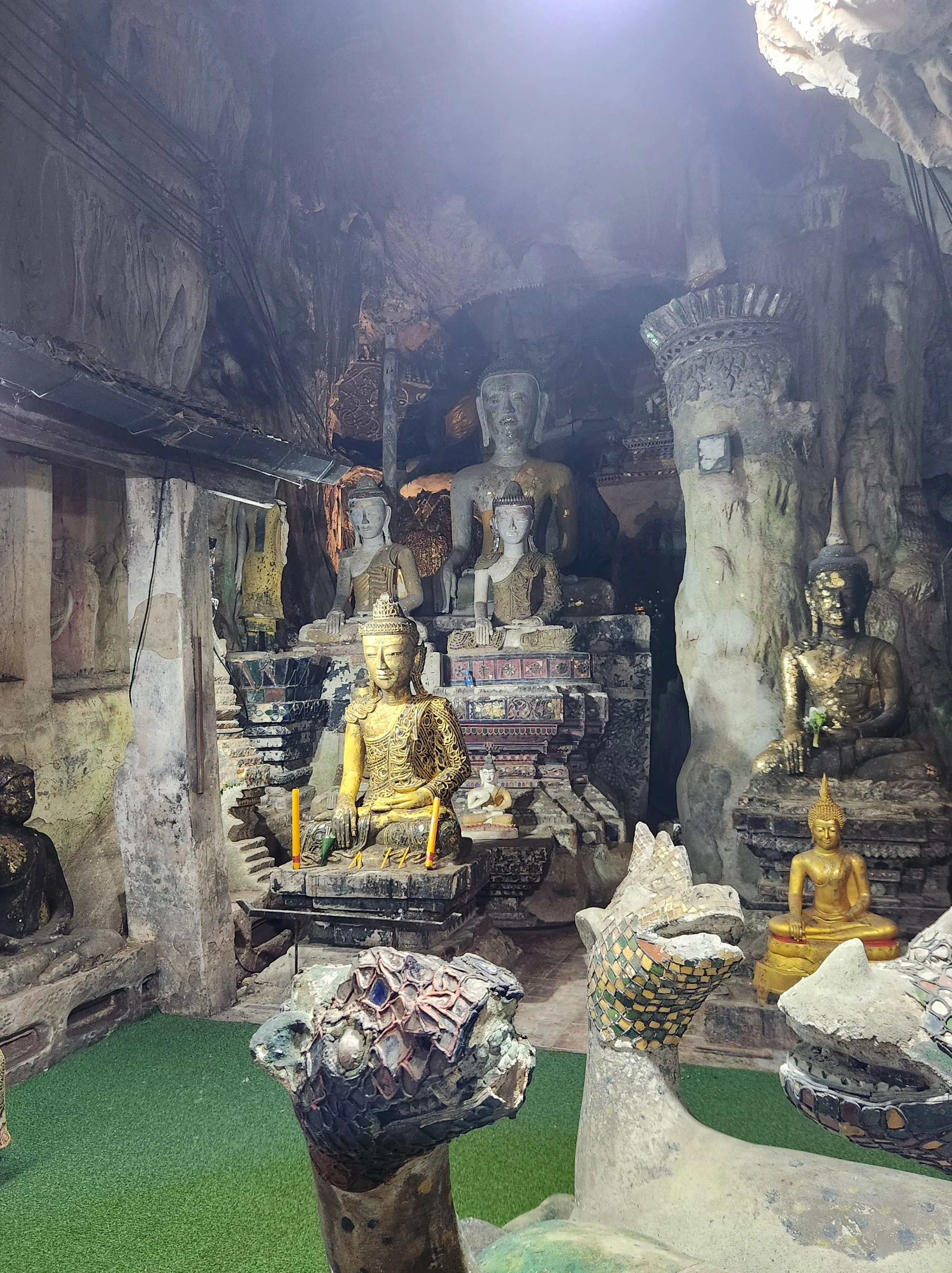 Before the entrance to the cave is a bridge over a pond with coy fish. Coy fish are one of those animals that can instantly put a smile on my face. They are ubiquitous in Thailand and their coloring and symbolism are beautiful. As you enter the cave you ascend a staircase that transports you into an enchanted world. Surrounding you are rich limestone stalactites hanging from the ceiling while artificial lights illuminate the pathway to your first stop: a shrine perched on a platform. Here lies hundreds of ancient Buddha statues. This was my first time ever going to a wat with my A-jaan who is very religious and knowledgeable about Buddhism. He educated me on some history and customs about Buddhism in Thailand.