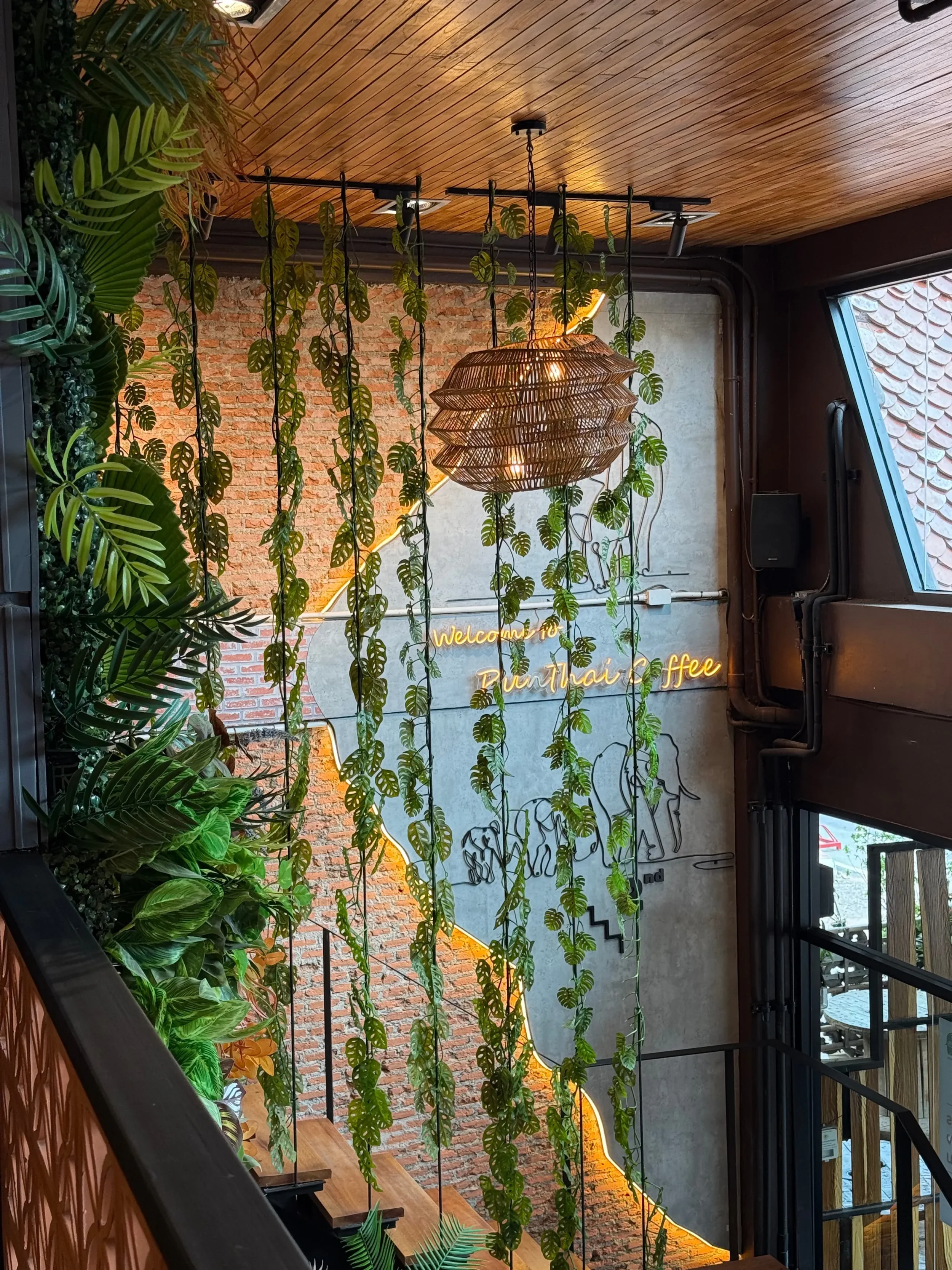 After exploring the premises, we were all profusely sweating and ready for some relief from the heat. We spent the next few hours sitting inside a Punthai Coffee across from Wat Ratchaburana. With large windows, neon signs, and many fake plants, it felt like I was sitting in a modern art museum turned coffee shop. We spent the next few hours sipping expensive matcha lattes and watching an absolute downpour begin that, unbeknownst to us, would linger for the remainder of our weekend away.